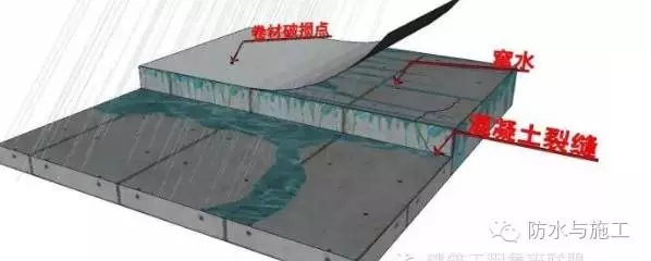 1)使用防水層材料不當引起。防水層選用的材料指標達不到要求,施工厚度不足、工藝不當、二種以上防水材料復合使用不當相互影響各自防水效果等。