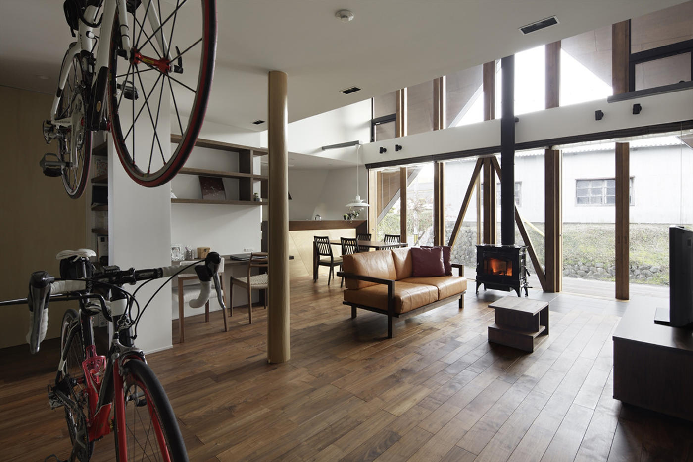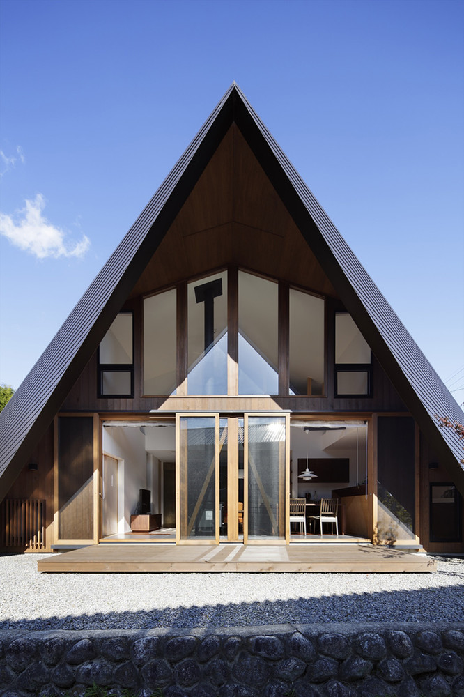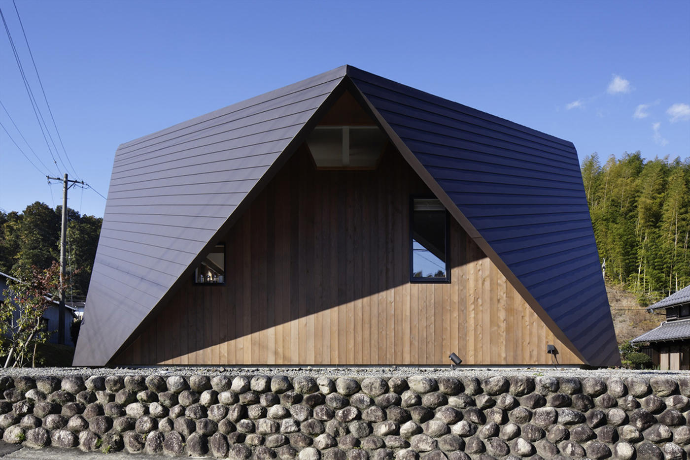 斜屋頂與地面相交,外形上加強(qiáng)了自身的存在感,同時(shí)也能抵抗強(qiáng)風(fēng)和地震,遮風(fēng)擋雨,也成為結(jié)構(gòu)的一部分。
