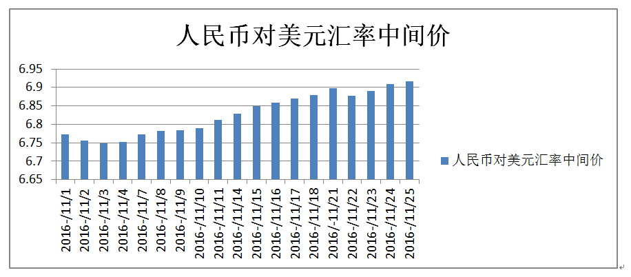 另一個值得關注的因素是人民幣對美元的匯率。因美元指數上漲,美元相對于世界其他主要貨幣日元、英鎊和人民幣等幣種升值較多, 造成日元較前貶值9%,人民幣跟跌,11月以來的人民幣對美元匯率柱狀圖體現尤為明顯。