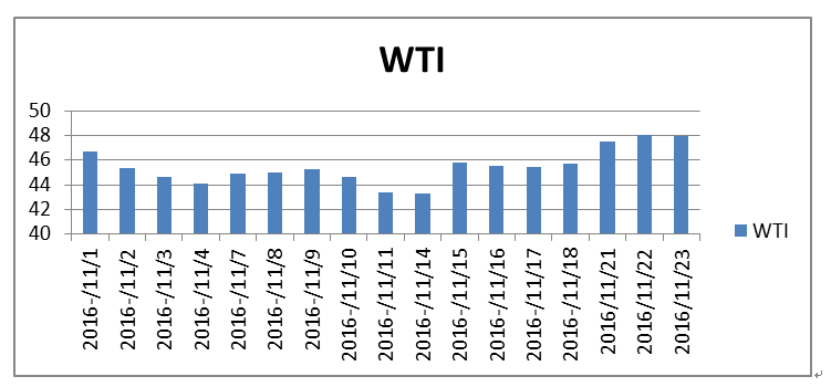 進入11月末以來, 行業(yè)人士預測OPEC落實減產協議的可能性增大,原油價格呈現上漲趨勢。11月30日, OPEC將在維也納召開第171屆例會,最后確定落實具體減產執(zhí)行細則,作為世界最大產油國之一的和非OPEC成員國的俄羅斯也可能參加此次會議,加入減產的行列。此前,反對減產或免除減產義務的伊朗等OPEC成員國釋放出了更多的善意,國際上普遍對此次會議成果寄予厚望。一旦減產協議落地,無疑將有力提升原油價格。2016年9月28日, OPEC就成員國減少原油產量達成原則性協議以來,國際原油價格起跌連連。國際原油主要基準價美國西德克薩斯中質原油(WTI) 本月的柱狀圖反映了這一基本面。