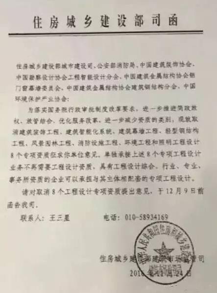 8個(gè)工程設(shè)計(jì)專項(xiàng)資質(zhì)包括:建筑裝飾工程,建筑智能化系統(tǒng),建筑幕墻工程,輕型鋼結(jié)構(gòu)工程??,照明工程,消防設(shè)??施工??程,風(fēng)景園林工程和環(huán)境工程,向城市建設(shè)司、公安部消防局,中國(guó)建筑裝飾協(xié)會(huì),中國(guó)勘察設(shè)計(jì)協(xié)會(huì)工程智能設(shè)計(jì)分會(huì),中國(guó)建筑金屬結(jié)構(gòu)協(xié)會(huì),中國(guó)建筑環(huán)境保護(hù)產(chǎn)業(yè)協(xié)會(huì)發(fā)出此征求意見函,要求在12月9日之前給予回復(fù)。