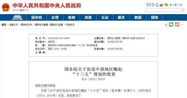 2016年12月23日,國務(wù)院下發(fā)《關(guān)于促進(jìn)中部地區(qū)崛起“十三五”規(guī)劃的批復(fù)》(國函〔2016〕204號)。