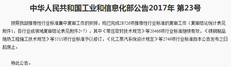 6月2日,工信部發(fā)布2017年第23號公告。公告稱按照工信部推薦性行業(yè)標(biāo)準(zhǔn)集中復(fù)審工作的安排,現(xiàn)已完成28726項(xiàng)推薦性行業(yè)標(biāo)準(zhǔn)的復(fù)審工作,20466項(xiàng)行業(yè)標(biāo)準(zhǔn)繼續(xù)有效,5511項(xiàng)行業(yè)標(biāo)準(zhǔn)予以修訂,2749項(xiàng)行業(yè)標(biāo)準(zhǔn)自本公告發(fā)布之日起廢止。在廢止的2749項(xiàng)行業(yè)標(biāo)準(zhǔn)中,含瀝青柔性復(fù)合胎防水卷材、氯化聚乙烯-橡膠共混防水卷材等7項(xiàng)防水材料標(biāo)準(zhǔn)。詳見下表: