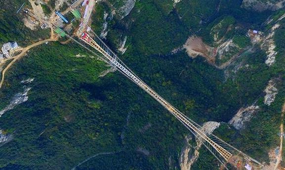 歷時(shí)四年多建成的張家界玻璃橋,不僅是一座景觀橋梁,而且兼具游客通行、蹦極、溜索等功能。橋梁采用空間索面地錨式懸索橋結(jié)構(gòu)形式,主跨達(dá)430米,寬6米,橋面距谷底約300米,具有橋跨大、橋面窄、重量輕等結(jié)構(gòu)特點(diǎn)。橋面由玻璃組成,最大游客容量為800人。