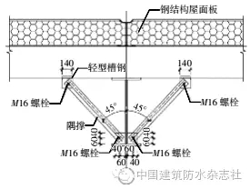 鋼骨架輕型屋面板的防水設(shè)計與施工是本工程的控制重點,對于整體屋面防水具有重要作用,圖1為屋面板節(jié)點安裝示意。