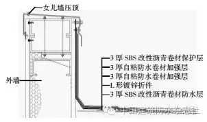 針對屋面風(fēng)機、采光天窗等屋面凸起部位,其基礎(chǔ)根部應(yīng)磨成圓弧狀,從而防止卷材在平、立面交接位置磨損而造成卷材開裂,并采用相應(yīng)防水措施。譬如,在采光天窗部位施工中,應(yīng)充分考慮天窗寬度是否會影響到整個屋面的排水,如果天窗在垂直屋面排水方向長度較大時,在暴雨侵襲時,急劇水流可能在碰觸到天窗立面后上翻形成“波浪”,雨水會直接灌入卷材封口的壓邊內(nèi)。為此,在施工中應(yīng)充分考慮這一因素,可在天窗的迎水面設(shè)置“分水嶺”,從而改變水流方向,防止雨水在天窗立面上翻形成“波浪”;也可以直接將屋面防水卷材包邊至天窗頂面,再采用壓條或基座本身壓密,利用卷材自身的柔性密封作用,防止雨水滲入。在大型倉庫、商場等關(guān)鍵建筑物上,建議同時采用以上兩種作法,從“疏”、 “堵”兩個方面同時著手,解決該部位滲水難題。采光天窗部位防水做法,見圖3。