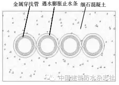 針對出屋面線管、線管群等部位,由于鋼筋混凝土屋面是將帶有阻水環(huán)的鋼管直接預(yù)埋在混凝土中,屋面自防水就能很好地解決這些部位的滲水問題;而輕型屋面板是在工廠預(yù)制、現(xiàn)場安裝的,且相鄰板縫間采用的是微膨脹珍珠巖水泥砂漿,因此原混凝土屋面工藝作法在輕型屋面板中不適用。根據(jù)輕型屋面板的自身工藝條件,確定施工方案為:屋面穿線管、線管群通過相鄰短邊板縫或預(yù)留孔穿出屋面,將線管、線管群固定在屋面板肋板上,再采用膨脹橡膠止水帶以“8”字形連續(xù)纏繞在線管上(圖4),然后在出屋面部件處澆筑細石混凝土墩,最后對于突出屋面部件進行防水卷材的粘貼施工。