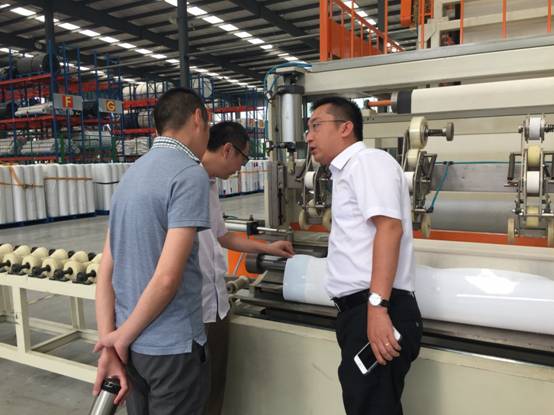 會(huì)后,綿陽(yáng)樊華房地產(chǎn)開發(fā)有限責(zé)任公司領(lǐng)導(dǎo)一行在公司總經(jīng)理史文俊陪同下參觀了卷材生產(chǎn)線、展廳和實(shí)驗(yàn)室,隨后就多種防水材料的施工工藝展開交流。
